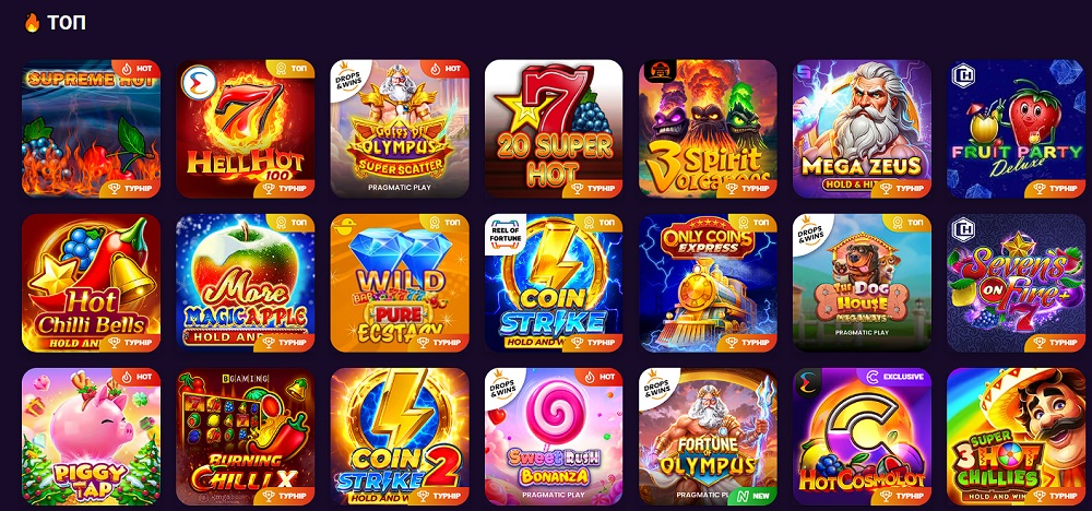 У центральній частині сторінки відображається каталог слотів. Для зручності ігри згруповані за категоріями, що дозволяє швидко знайти потрібний формат.