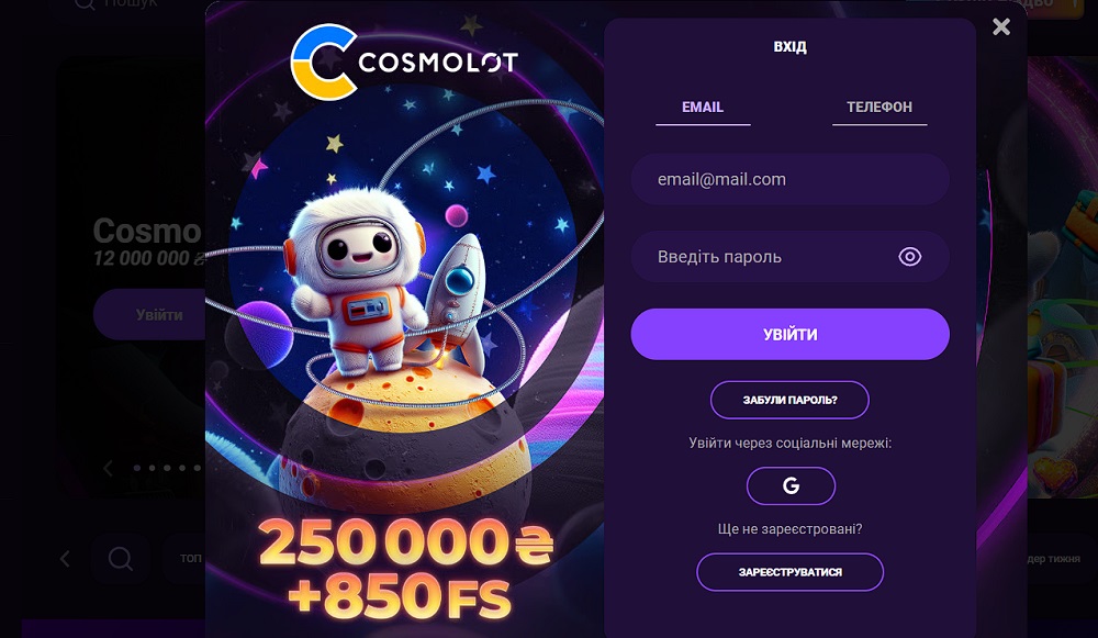 Щоб увійти в акаунт Cosmolot Casino, достатньо ввести email або номер телефону та пароль. Вхід доступний з комп’ютера і з мобільного через браузер.